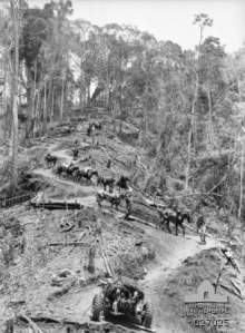 Where 10 Pl was we were on a fairly open area.  There was some heavy timber behind but we were on an open area as were the 2/14th and 2/16th.  Up behind where I was on the edge of the trees was a 3rd Bn 3 inch mortar.  This is before the 14th of September.  I went up to the mortar fellows because I knew once they opened fire the Japanese would send over counter mortar fire to try and get the mortar and we were underneath that line of fire.  When I went up to talk to them I discovered they had no sights for their mortar and they only had 12 high explosive mortar bombs.  12, 10 pound projectiles.  So I said to them get rid of them as quick as they could and do it pretty well straight away. One mortar man said, “Where are the Japanese?” I said they are just down the creek a bit.  About 1200 yards away at that stage.  One fellow lined up the barrel and another organised the bombs to be dropped down.  So they fired rapid fire to get rid of the 12 bombs and they picked up their mechanism, base-plate, barrel and tripod and off.  Needless to say, within a few minutes Japanese shells came right over the 10 Platoon positions but weren’t dropping short.  If they had they would have got some of our fellows.  Luckily they went into the timber and they fired there for some time.